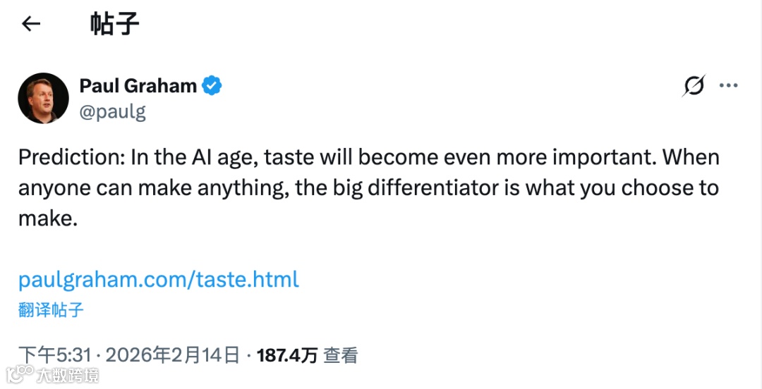 「预测:在人工智能时代,品位将变得更加重要。当任何人都可以创造出任何东西时,真正的区别在于你选择创造什么。」