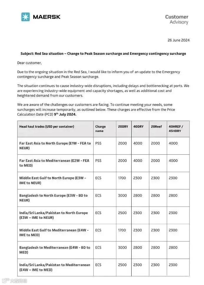 马士基上调亚欧航线的FAK费率至最高9400美元/FEU,7月1日生效。7月9日起,马士基还将远东亚洲到北欧的旺季附加费(PSS)上调至小柜2000美元和大柜4000美元。