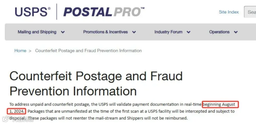 自2024年8月1日起,USPS将实时验证付款文件,包裹若在首次扫描时未列入清单,将被拦截处理,不再重新进入邮件流,且发件人不会获得补偿。