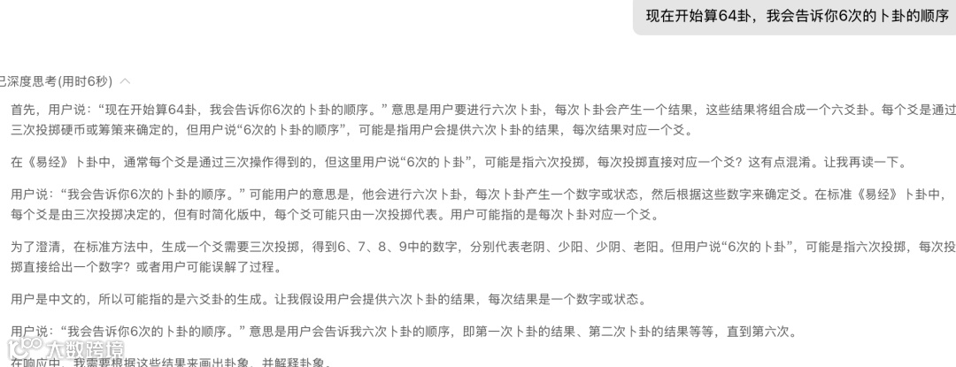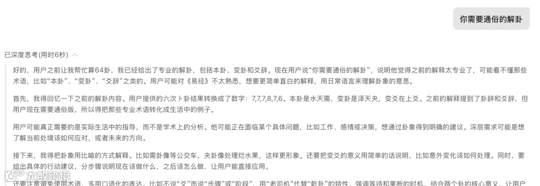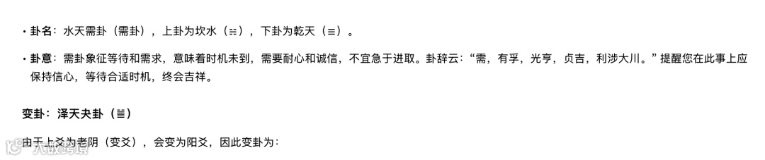 现在AI语言大模型非常厉害,你也可以直接在对话框输入你得到的卦象,询问你想要的问题,它会给你解卦。