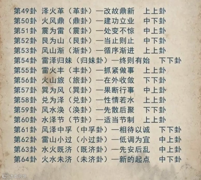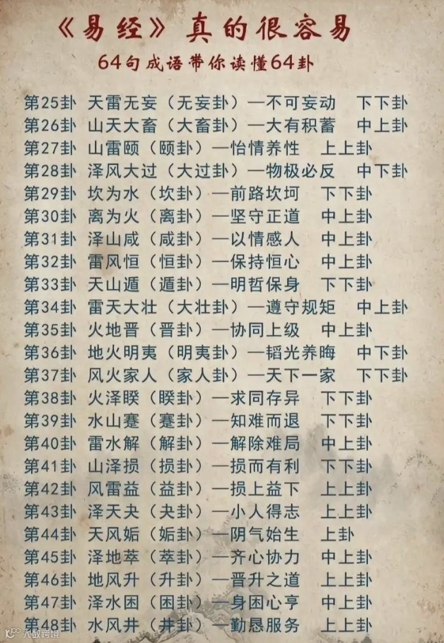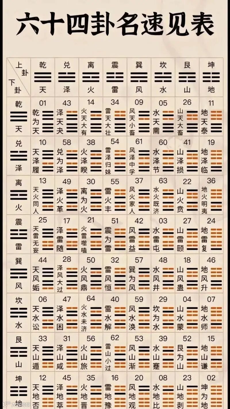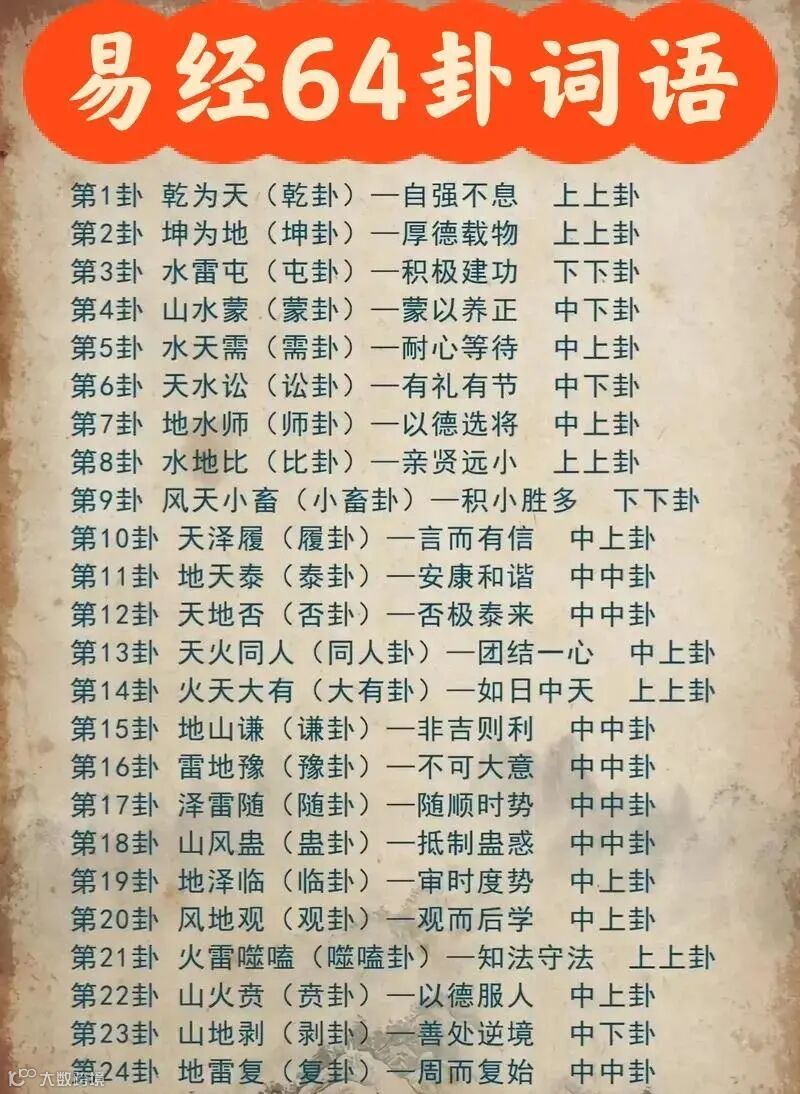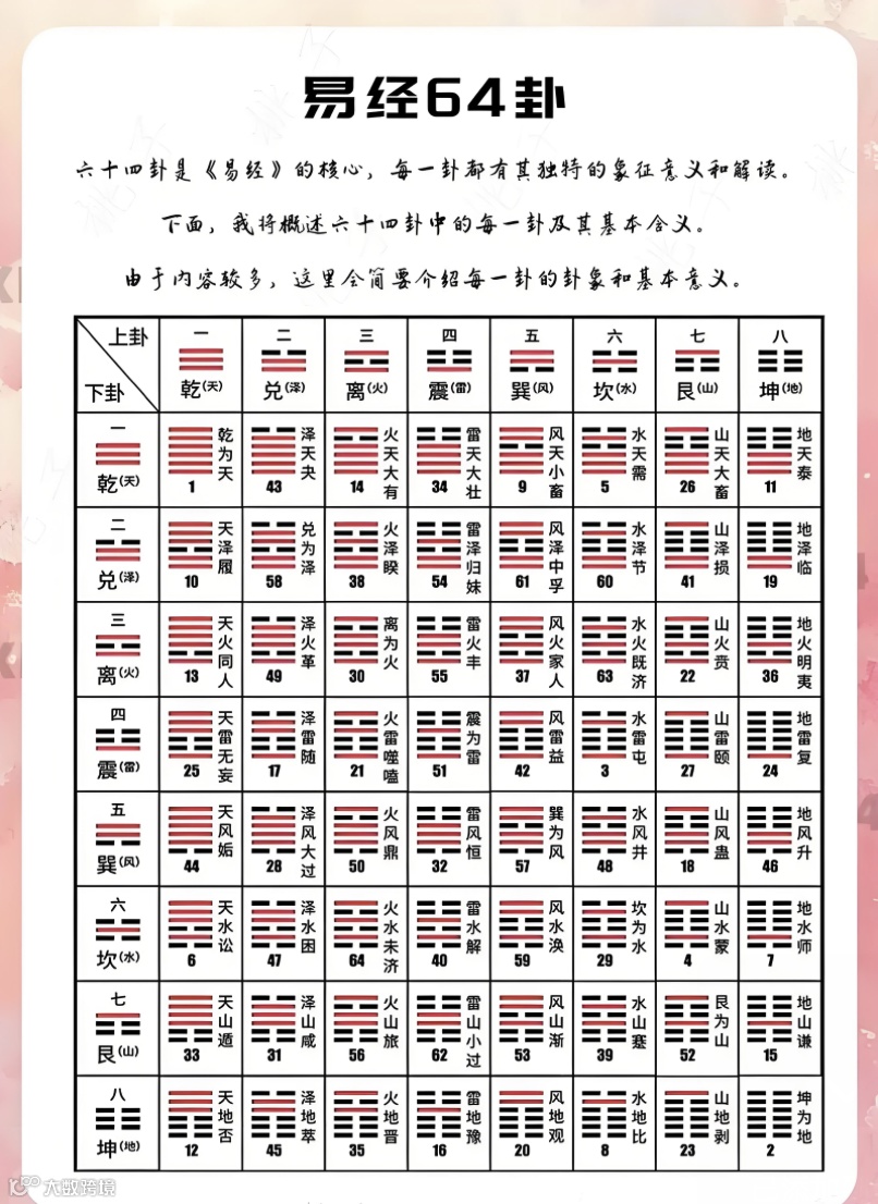 64卦就是《易经》里的64种“人生剧本”,每个卦象用6条杠(—代表阳、--代表阴)组合而成,告诉你某种处境下该怎么应对。