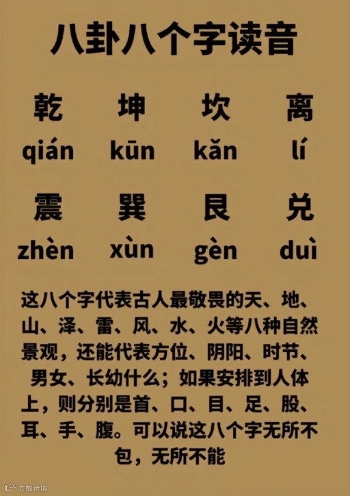 乾(天)☰、坤(地)☷、震(雷)☳、巽(风)☴、坎(水)☵、离(火)☲、艮(山)☶、兑(泽)☱