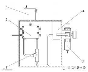 微量润滑装置悬挂于机床,可根据主轴转速动态调节供油量,提升润滑效率。系统结构如图3所示,包含油气混合装置、油泵、油箱、气泵及气体过滤器,保障润滑介质清洁与稳定输送。