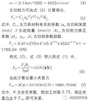 夹紧力计算基于静力平衡原则,确保在主切削力作用下不发生位移。设定铝合金轮毂加工参数:转速2500r/min,切深4mm,进给量0.5mm/r,工件直径580mm,经计算满足最小夹紧力要求。