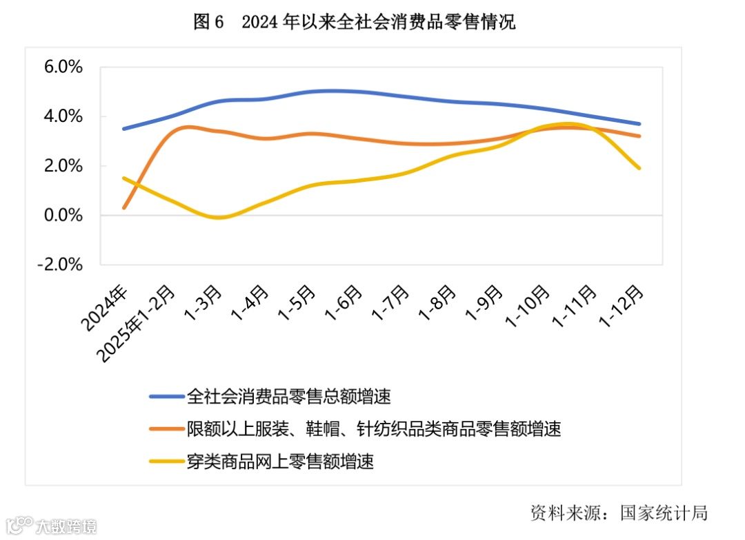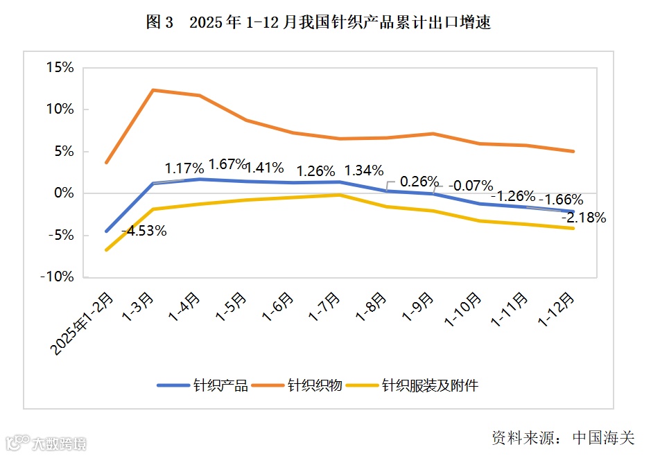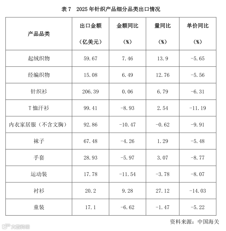 出口品类量增价跌,出口结构向价值链上游攀升。2025年,起绒织物、经编织物、针织衬衫出口表现良好,出口增速分别为7.46%、6.49%、9.28%,其中,针织衬衫出口额占衬衫出口额的33.25%,同比提升4.42个百分点。T恤汗衫、内衣家居服、运动装受去年同期高基数影响,出口分别下降8.93%、10.47%、11.54%。针织织物出口保持连续增长态势,在针织产品出口中的占比持续提高,科技进步推动出口结构向价值链上游攀升。另一方面,主要品类普遍出现量增价跌,反映出在劳动力成本优势减弱背景下,低附加值产品面临的国际竞争尤为激烈,企业需要通过科技创新,加大高端化、功能化、绿色化等高附加值、差异化产品的开发,从依靠低成本规模优势的OEM模式,向依托技术、设计和快速反应能力的ODM模式和品牌化转型。