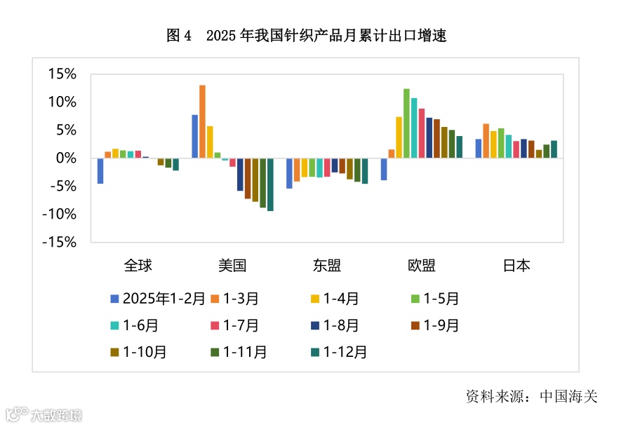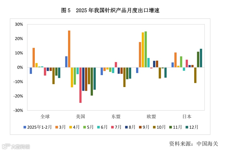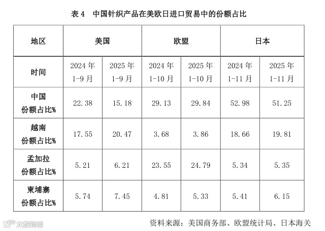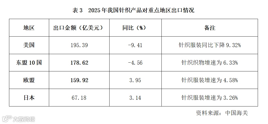 出口市场格局深度调整。2025年,受关税政策影响,对美国出口195.39亿美元,同比下降9.41%,我国产品在美市场份额面临结构性挤压,据美国商务部数据,2025年1~9月,我国针织产品在美进口市场份额从2024年的22.13%急剧下滑至15.18%,越南市场份额则提升至20.47%,首次超越中国,订单向越南、柬埔寨等东南亚国家转移趋势明显。对欧盟出口159.92亿美元,逆势增长3.95%,据欧盟统计局数据,2025年1~10月,我国针织产品在欧盟进口贸易中占比由2024年的29.32回升至29.87%,领先第二名孟加拉5.08个百分点,显示出行业的出口韧性。对日本出口67.18亿美元,实现3.14%的增长。据日本海关数据,2025年1~11月,我国针织产品在日本进口贸易中占比由2024年52.81%小幅回落至51.25%,仍呈下降趋势。对东盟10国出口178.62亿美元,同比下降4.56%,而针织织物出口则同比增长6.33%,反映出美国关税政策对成品转口贸易的影响和我国针织织物在东盟市场的竞争优势。