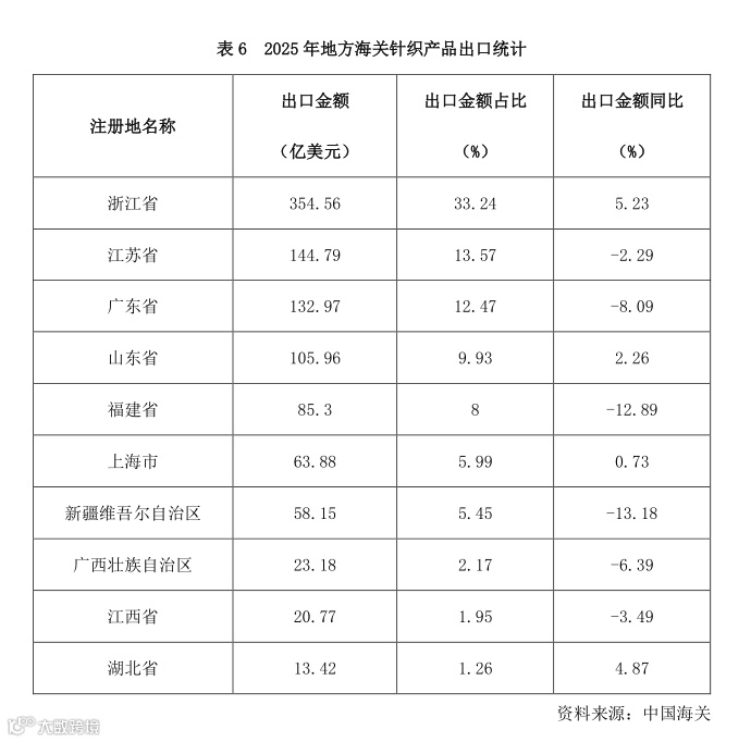 区域出口分化明显,新疆成为新的战略支点。东部沿海省份凭借产业集群、供应链配套等优势,仍是出口主力军。2025年,浙江、山东保持增长,出口额同比分别增长5.23%、2.26%。江苏同比微降2.29%,整体保持稳定。广东、福建则分别同比下降8.09%、12.89%,面临出口调整压力。中西部及沿边地区出口呈现差异化态势,得益于近几年政府对行业的政策支持,湖北出口同比增长4.87%,广西、江西出口额则分别下降6.39%和3.49%。区域出口分化的背后,是产业转移、政策支持、市场辐射等多重因素的综合影响,也为行业优化区域布局提供了方向。新疆作为战略新支点角色凸显,尽管1-12月出口额受短期贸易波动影响同比下降13.18%,但其依托“一带一路”核心区区位优势、不断完善的纺织产业链以及面向中亚的独特市场通道,已成为行业未来开拓欧亚大陆市场的关键跳板和产能转移的重要承载地,长期增长潜力巨大。