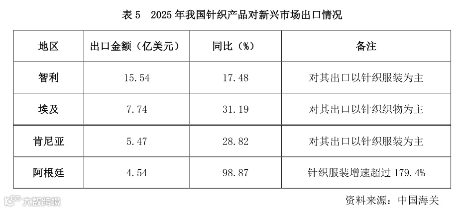 2025年,我国对智利出口15.54亿美元,同比增长17.48%,出口以针织服装为主;对埃及出口7.74亿美元,同比增长31.19%,以针织织物为主;对肯尼亚出口5.47亿美元,同比增长28.82%,针织服装占比居前;阿根廷出口4.54亿美元,同比激增98.87%,其中针织服装增速超过179.4%,展现出新兴市场的巨大潜力。尽管当前基数较小,但已成为驱动出口增长、分散市场风险的重要新兴力量。