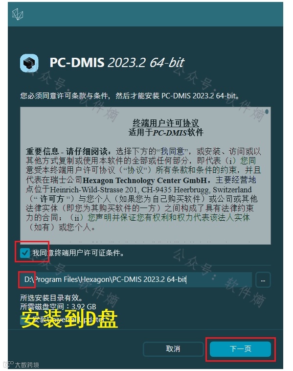 勾选“我同意”,将安装路径更改为D盘,点击“下一页”。