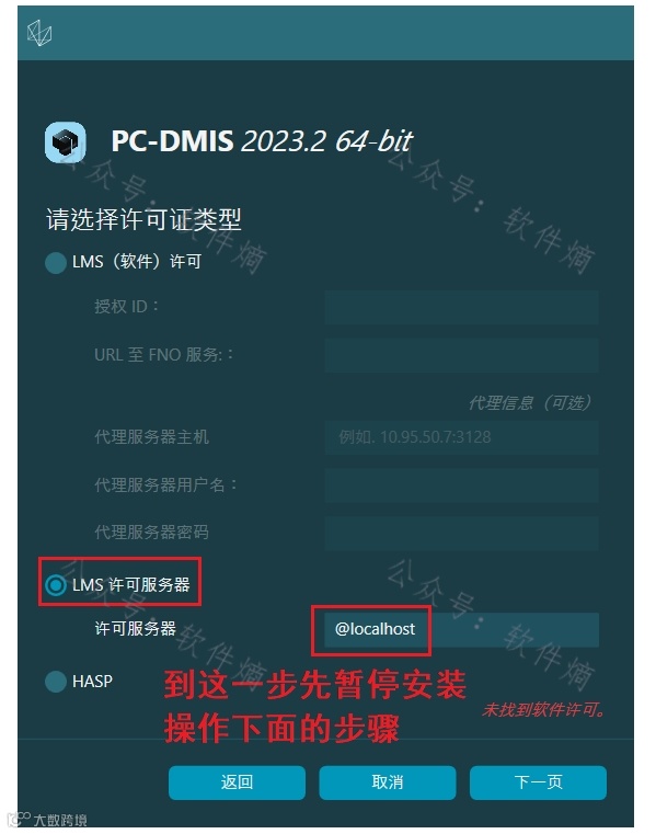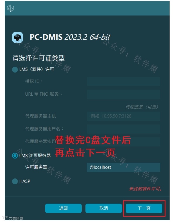 选择“LMS许可服务器”,输入“@localhost”,暂停安装,准备进行文件替换。