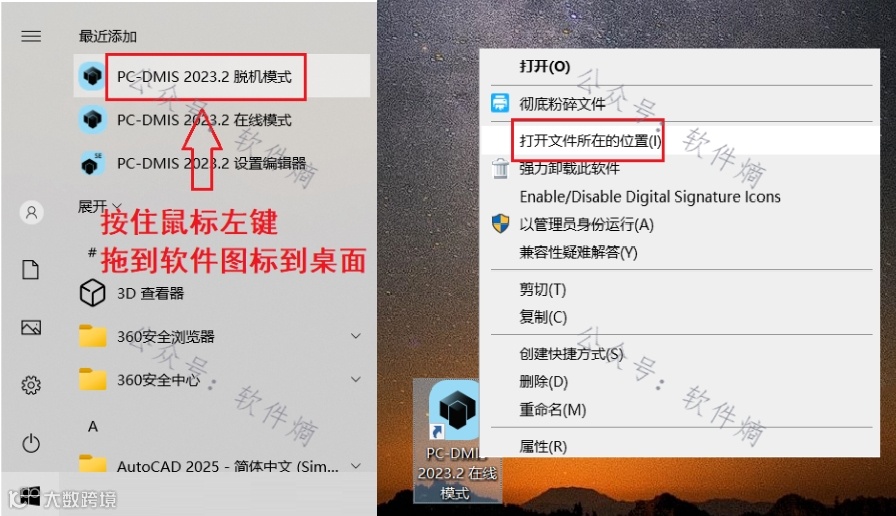 打开开始菜单,将软件图标拖至桌面,右键图标选择“打开文件所在位置”。