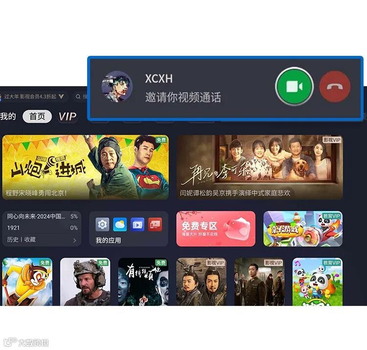好友可点击原邀请信息“回拨”至电视端。电视右上角将弹出“来电提醒”,选择接听即可继续通话。
