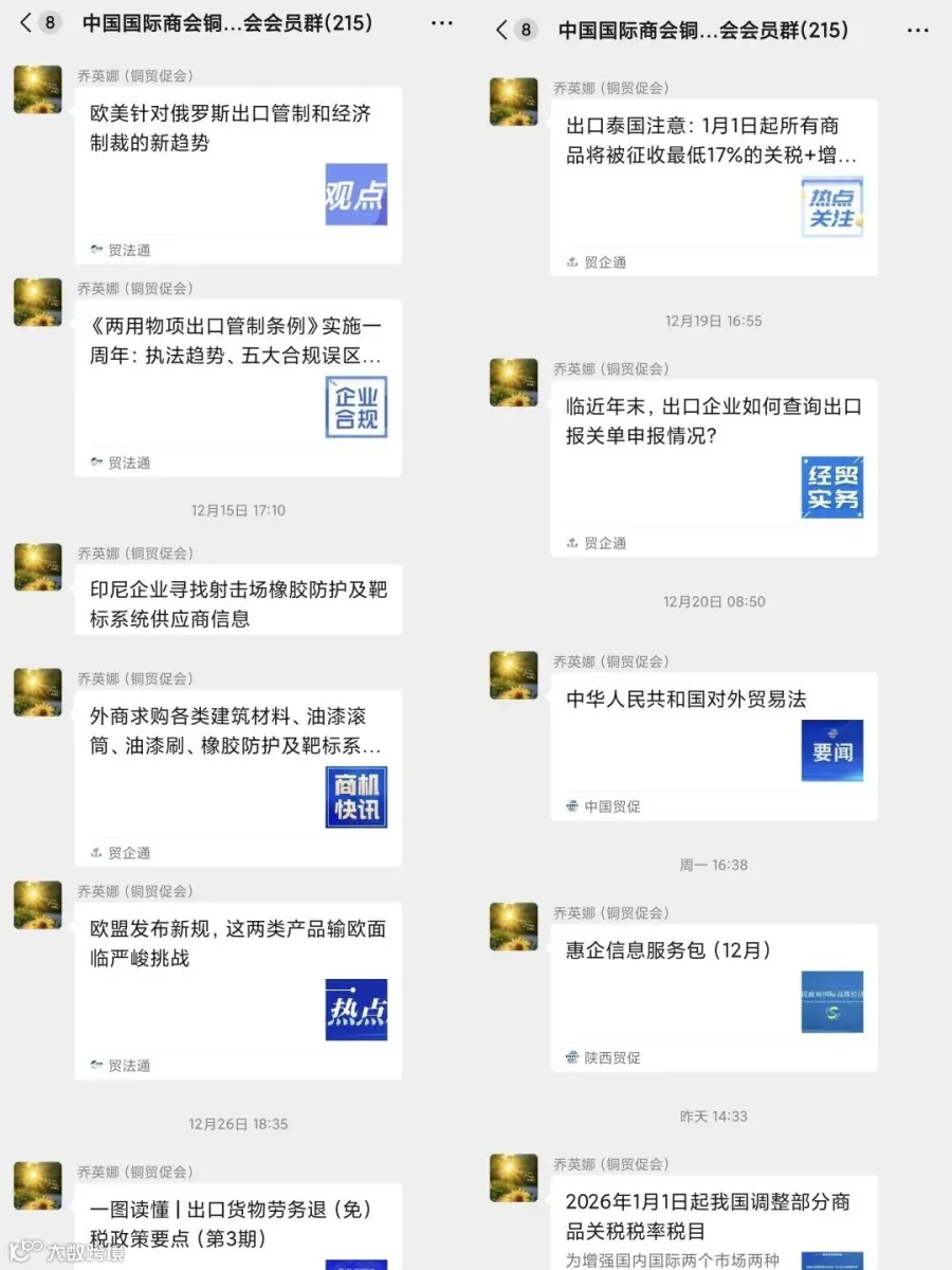 及时向企业传递经贸资讯、营商环境、海外供需等信息,在商会会员企业微信群推送相关内容239条;法律服务中心为会员企业提供法律服务117项。