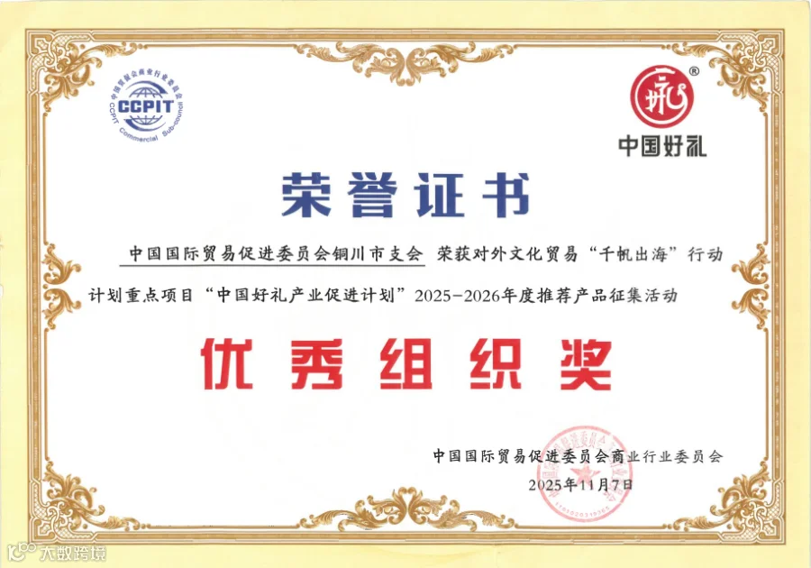 被中国贸促会评为对外文化贸易“千帆出海”行动计划重点项目“中国好礼产业促进计划”2025-2026年度推荐产品征集活动“优秀组织奖”