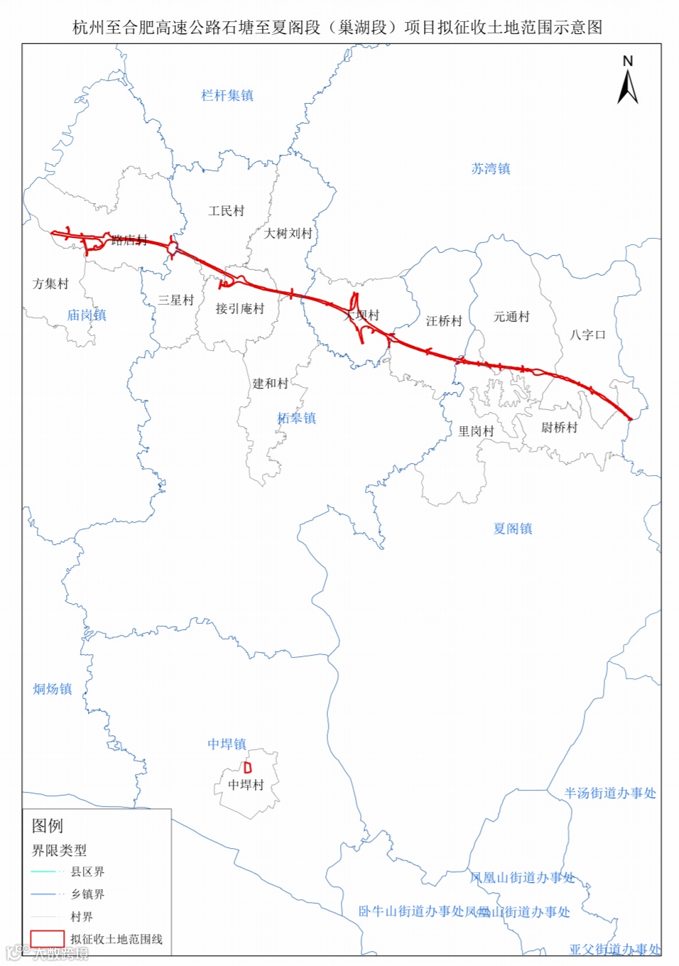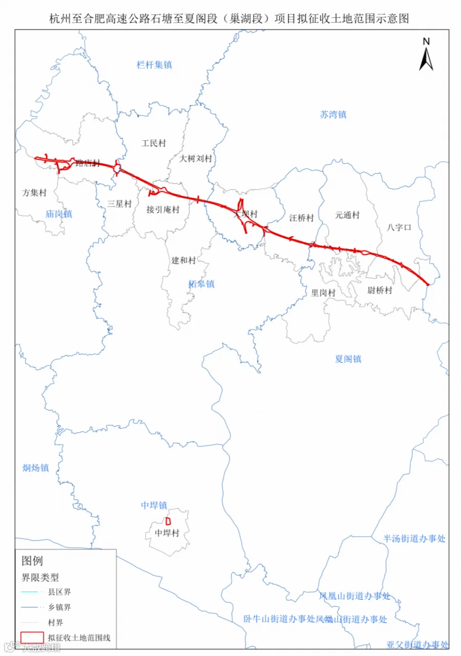 本次拟征收土地位于巢湖市庙岗镇方集村委会下份马村民小组,路店村委会沃子郑、瓦方、小吴、洪冲、小邱、小周、田埠、涧周、甘店、梁坎、芦池李、郑冲村民小组;柘皋镇三星村委会早树岗、大坝村民小组,工民村委会南方、小夏、大方、大桥村民小组,接引庵村委会赵南桥、赵云、靳坝、小店、百合冲、柯子刘、院子陈、储田埠、何家岗村民小组,大树刘村委会大树刘村民小组,建和村委会沈碾村民小组,汪桥村委会唐虎、马山、大桥、兴华、小吴、塔花、清泉、六甲王、季庄、小熊、谈家地、小裴、小李村民小组;苏湾镇大坝村委会冲里靳、石塘韩、吴大明、塘堰、何稍靳、砂石岗、团山靳、汤岗、石桥、小王、二甲王村民小组;夏阁镇里岗村委会大裴、小祖村民小组,元通村委会老靳、花三、花四、大冲、双冲、小冲村民小组,八字口村委会塘坝院、姚洼、古埂、联合、清坝村民小组,尉桥村委会下连村民小组;中垾镇中垾社区窦村居民小组范围内。具体详见拟征收土地范围示意图。