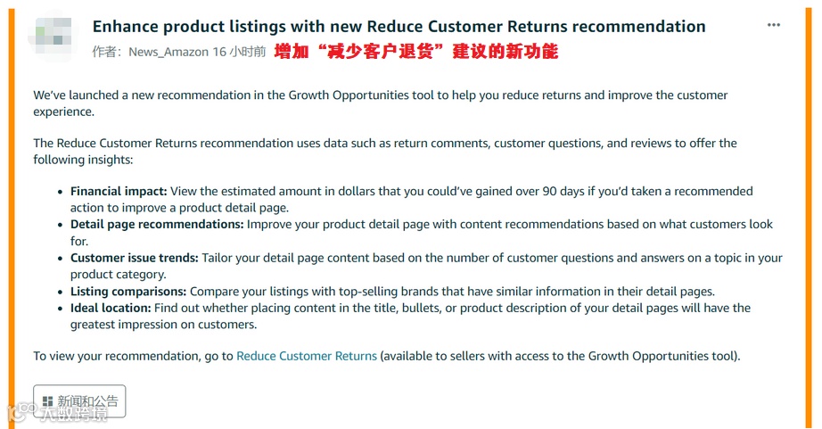 他们在美国站推出了一个叫做“减少客户退货”建议的新功能。