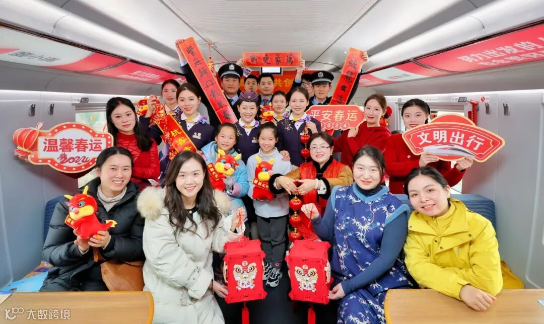 活动现场一副副春联、“福”字送到旅客手中,候车室洋溢着欢乐喜庆氛围,书法家们还登上高铁为旅客送“福”。