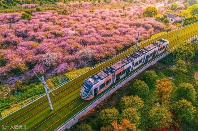 电车平缓的驶过大片垂丝海棠花群