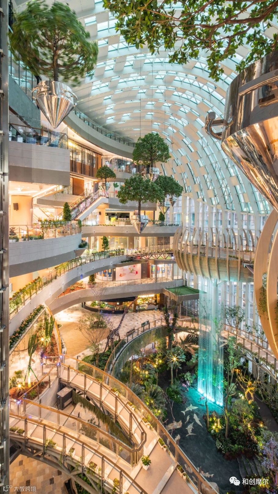 「生命树、悬浮森林、花之瀑谷」3大主题场景在内的12处打卡景点,又以连通不同楼层商业购物区域的「风语步道+天空鸟居」,构建了丰富的视觉层次和无边界客流互通。
