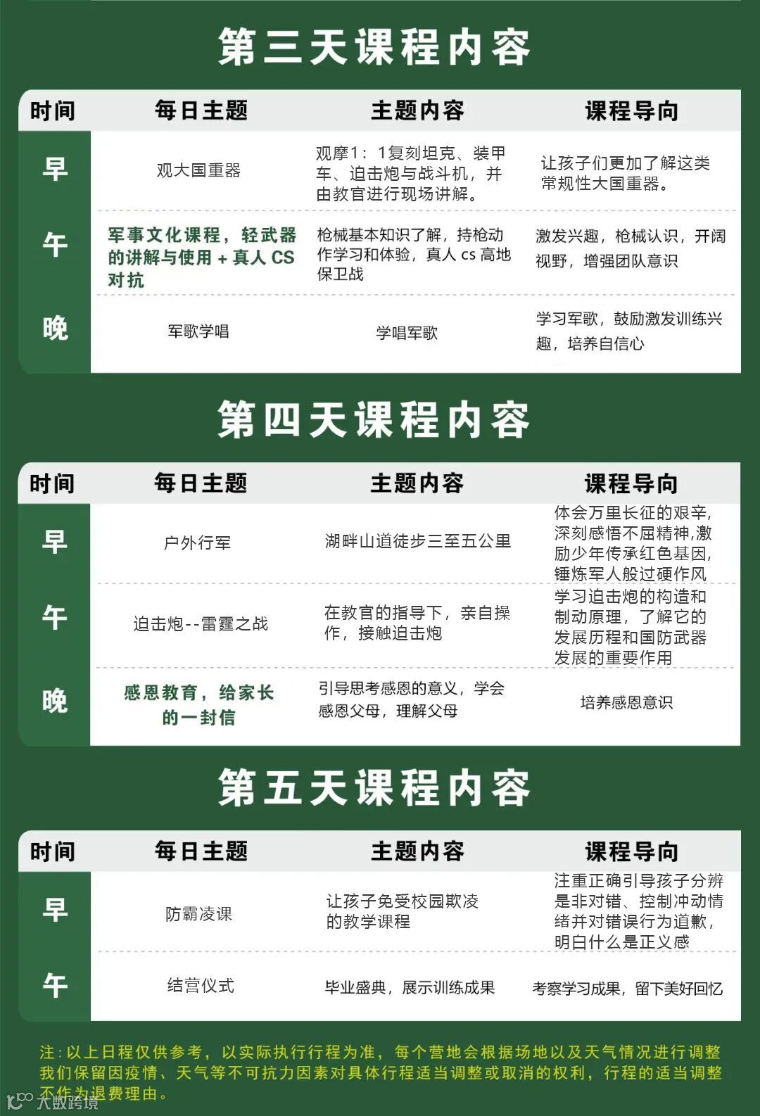 食宿、军事迷彩服、保险、活动执行、教具设备、门票、证书、教官等费用。