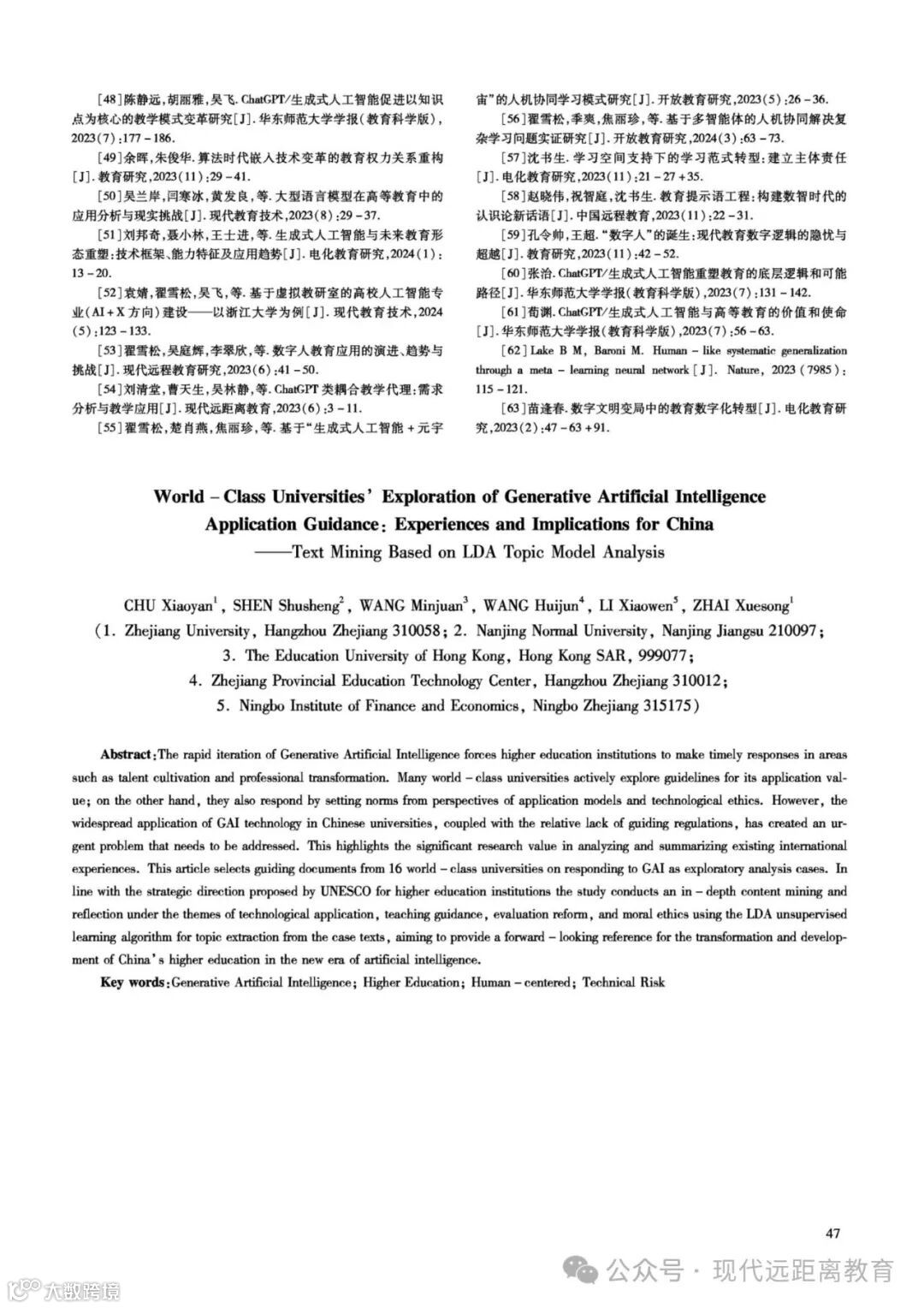 引文请注明:楚肖燕,沈书生,王敏娟,王会军,李晓文,翟雪松. 世界一流高校探索生成式人工应用规范的经验及对我国的启示——基于LDA主题模型分析的文本挖掘[J].现代远距离教育,2024(03):38-47.