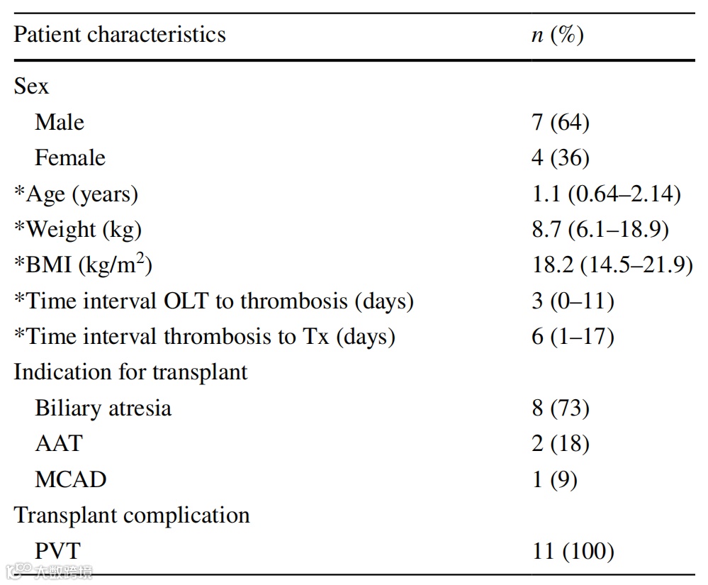 11例患儿确诊为急性PVT,包括胆道闭锁8例(73%)、α-1抗胰蛋白酶缺乏症(AAT)2例(18%)、中链酰基辅酶A脱氢酶缺乏症(MCAD)1例(9%)。