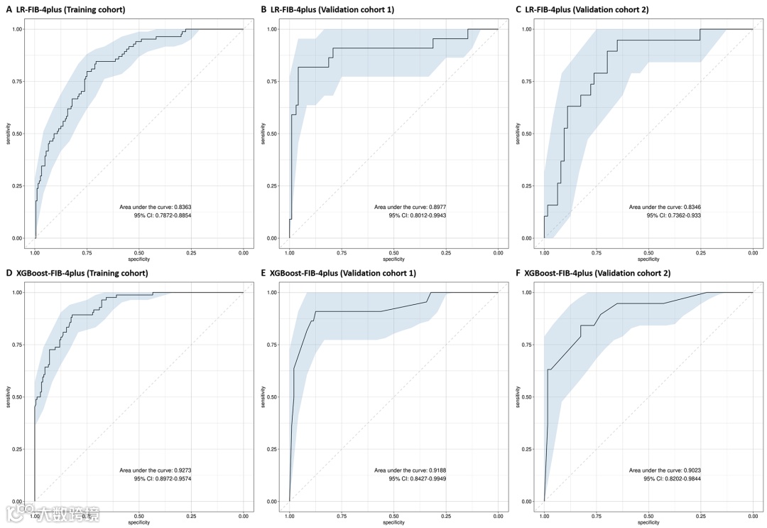 本项国际多中心研究纳入了502例代偿期肝硬化患者,其中训练队列268例,两个外部验证队列分别为118例、82例,另纳入瞬时弹性成像队列34例。结果显示,FIB-4plus评分在排除高危静脉曲张(HRV)方面的敏感度和阴性预测值均大于0.95。同样,FIB-4plus评分在诊断HRV时的特异度和阳性预测值也均超过0.95。基于最佳截断值,FIB-4plus评分在评估HRV方面表现出良好的价值,其受试者工作特征曲线下面积均大于0.9,优于单独使用FIB-4、SSM或LSM。