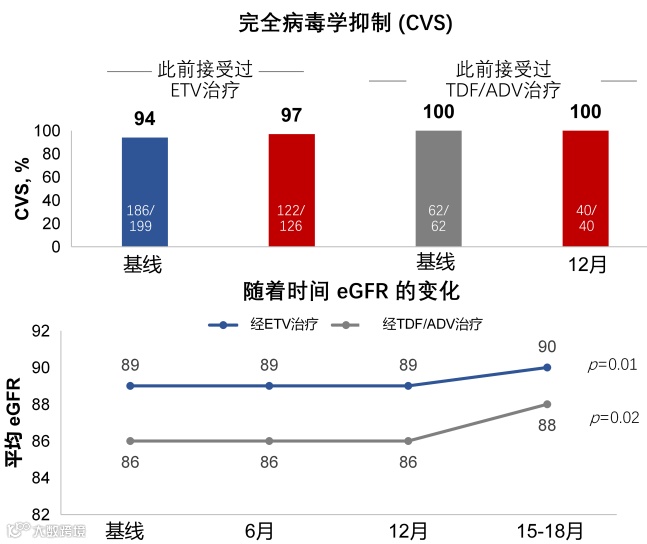 结果显示,基线接受ETV治疗的患者,在转换TAF治疗12个月后,病毒抑制率显著上升,而基线接受TDF/ADV治疗的患者,在转换TAF治疗12个月后,在维持完全病毒学抑制的同时,生化学应答(男性/女性ALT<35/25U/L)也有所升高,从基线时的74.2%升高至84.2%。