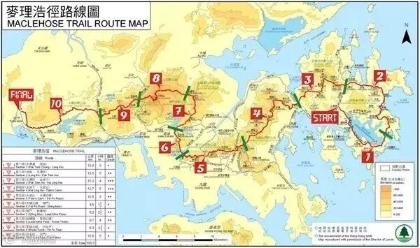 麦理浩径横跨香港24个郊野公园中的8个,沿途要翻越二十多座山头,如420米的牛耳石山、702米的马鞍山、649米的草山和957米香港最高峰的大帽山等。