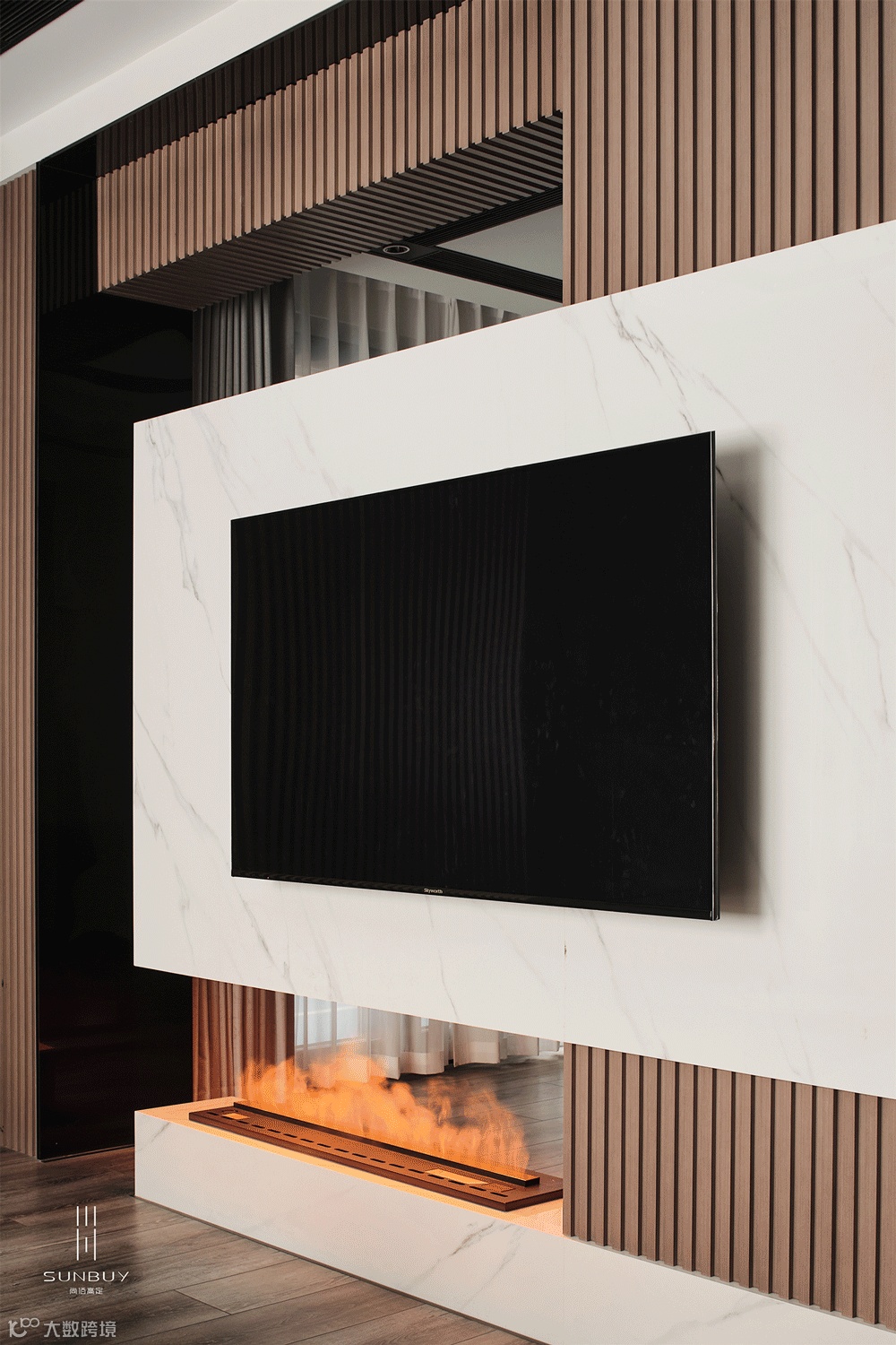 简洁利落的线条,木石组建的空间,使客厅有高级大气之感。棕色竖纹格栅墙板和云纹大理石的组合,三重框线的组合,给视觉以层次感。