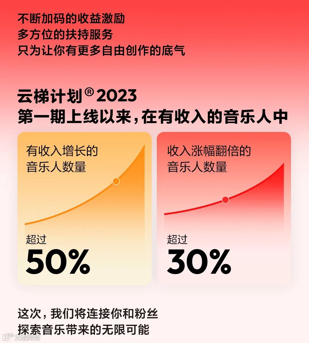 顺势而为,网易音乐人于2018年上线了「云梯计划」,更深入参与到音乐人收益与流量的扶持中去。比如,其不仅推出平台播放收益分成比例接近100%的政策,还提高了音乐人的广告分成,获得“赞赏”功能收益,不断为音乐人拓展收益渠道。数据显示,在去年的「云梯计划2023」中,共有超13万音乐人通过现金激励实现收益提升。