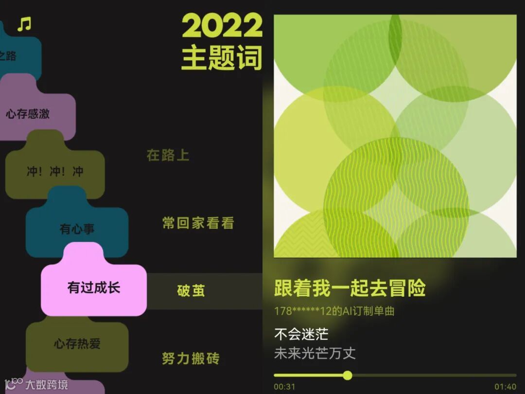在听歌报告的尾声,用户可以自行选择代表自己过去一年的的两个主题词块,并在细分下挑选更贴近自身的关键词,这些词组也就是用户的“年度歌词”,最终生成由AI制作的私人专属定制歌曲。比如在“有过成长”的分类下选择“破茧”,便会得到光芒、轻狂、梦想等年度歌词,一首名为《跟着我一起去冒险》的歌曲便就此诞生。