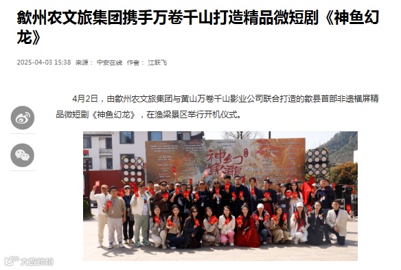 同时,2025年4月2日举办以徽州鱼灯文化为核心《神鱼幻龙》微短剧开机仪式,该微短剧将“鱼化龙”神话与徽州地方文化巧妙结合,不但展现徽州古城、鲍家花园、新安江山水画廊等歙县标志性景区的绝美风光,还进一步挖掘汪满田鱼灯、徽墨歙砚、徽派古建等非遗技艺,让观众感受徽州文化独特魅力。