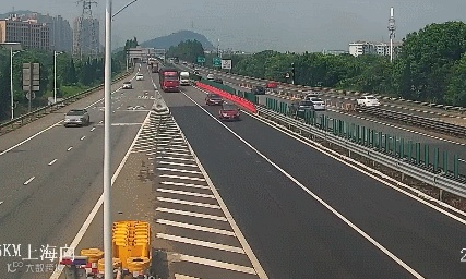 浙江甬台温高速,一辆红色小轿车在高速公路出口处突然从最内侧车道强行变道,被后方一辆大货车撞击。