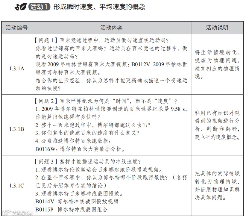 在本单元的学习中,我们通过研究运动 app(或电子地图)中呈现的代表运动物体的形状、运动轨迹、运动里程数、运动时间,以及实时监测的运动速度、海拔、起始位置等数据,使学生经历质点模型的建构过程,了解质点的含义,知道将物体抽象为质点的条件,能将特定实际情境中的物体抽象成质点;体会建构物理模型的思维方式,认识物理模型在探索自然规律中的作用。从运动 app 中研究运动信息到实验室中获取、研究运动信息,再到奥运会百米赛实际情境中研究运动信息,在这些过程中学生体验、学会如何获取物体运动信息,建立位移、速度概念,用 s-t、v-t 图像描绘物体运动,对物体的运动进行不同层次的描述。