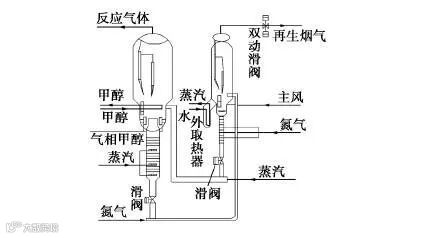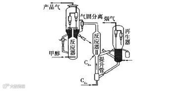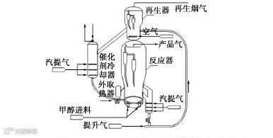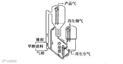 沉降器内催化剂分为两路:一路再生后返回,另一路循环至提升管下部。通过调节循环量控制催化剂含碳量。为避免高温引发副反应,再生催化剂经冷却器降温后再返入反应器,同时部分液态甲醇进料以吸收反应热。该工艺可减少催化剂返混、抑制副反应,但需高提升管以保证转化率,且温度控制难度较大。