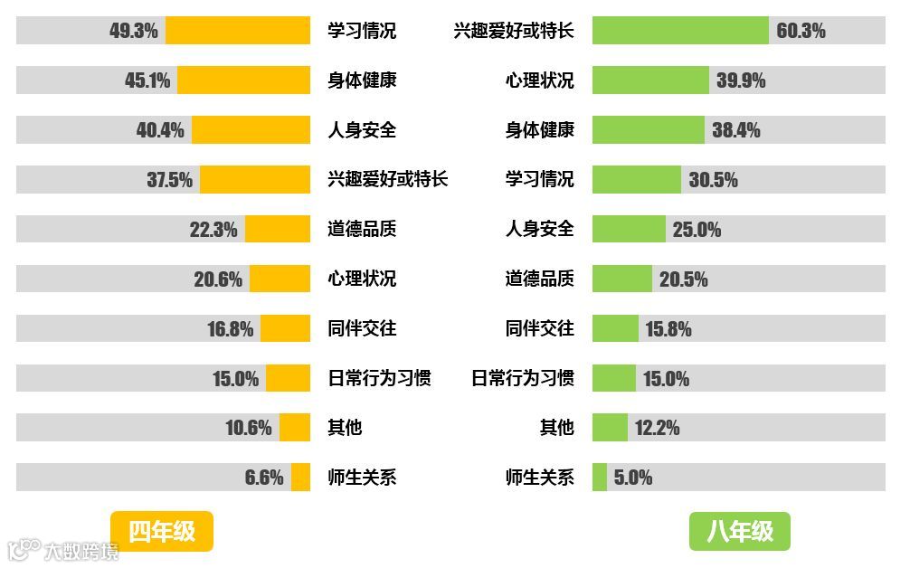 四年级学生认为家长最关注的和孩子最希望家长关注的前三位一致,但相对而言,学生更希望家长也可以关注自己的兴趣爱好或特长、同伴交往;