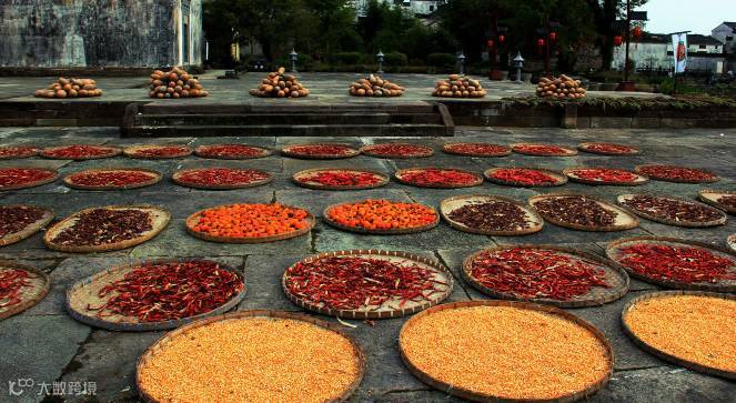 呈坎古村的晒秋.村名们把丰收的各种农作物都拿来晒上了。秋天是丰收的季节。