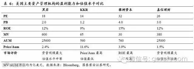 上文分析了海外资产管理的四类运营模式,我们同时比较了四类机构的盈利能力和估值水平。整体上,从盈利能力看,橡树资本最高(15%),其余三类保持在10%以上;从资管规模看,嘉欣理财和黑岩都可以管理2万亿美元规模,这与市值情况相一致,嘉欣理财和黑岩都可以成长为300亿美金的大市值机构,KKR和橡树市值在百亿元以内;从价值驱动看,KKR、橡树资本对资产端有控制能力,Price/Aum较高,而嘉欣理财主要做流量聚拢和资产配置,Price/Aum最低;从估值水平看,橡树资本和嘉欣理财估值水平较高,前者体现了资本市场对其针对不良债权定价能力(独特投资策略)的溢价,后者体现了聚拢流量、构建平台后的“护城河”价值,KKR的估值水平最低,这与公司有较多自营业务有关(成熟市场自营业务估值中枢1PB左右)。