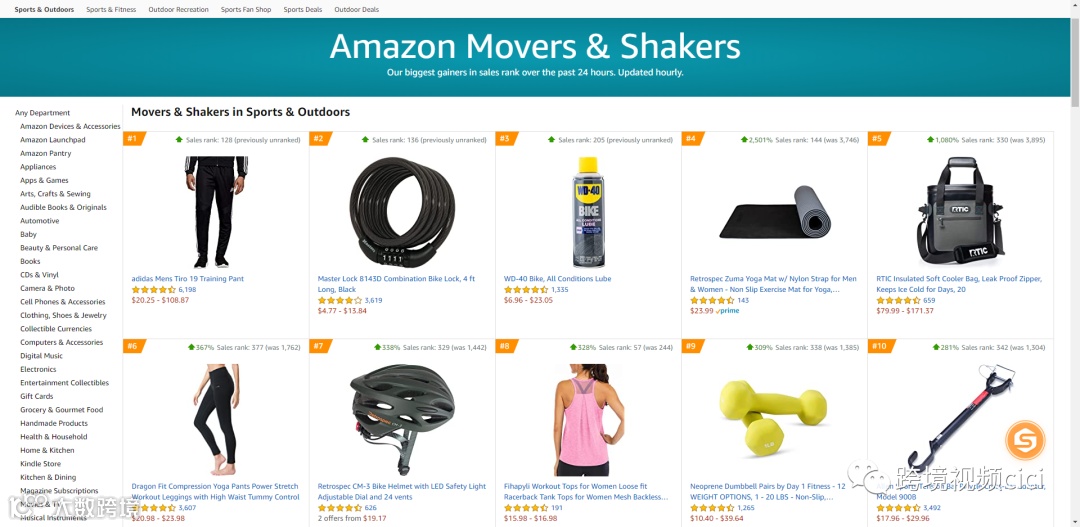 或者也可以查看亚马逊“Movers & Shakers”。它显示了过去 24 小时内销售排名的最大涨幅。会看到对以前平庸产品的需求突然激增。