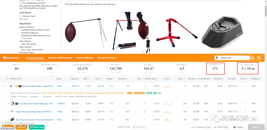 以卖家精灵为例。我们可以通过简单地尝试搜索几个不同的产品类别来确定在亚马逊上销售哪些产品。我们最初尝试了“足球三通”,但发现这不是一个好的利基市场: