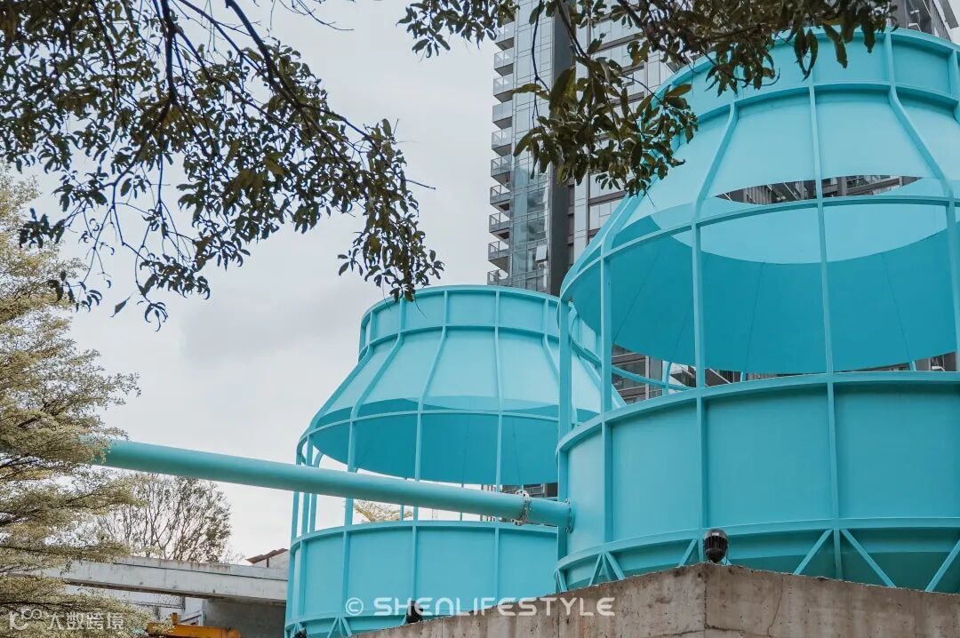 但同时,这里也展示了一座电厂最令人惊喜的下半乐章:过往那些个废弃的厂房、设备,如今已摇身一变成了一座微观城市;当年的冷却塔、油罐、混凝土梁柱,被保存改造之后,又成了新的建筑体,孩子、年轻人们在其中流连嬉戏。还有那一抹又一抹的深圳蓝,为旧砖画上新妆,与天空相映成趣,与绿植相互唱和。