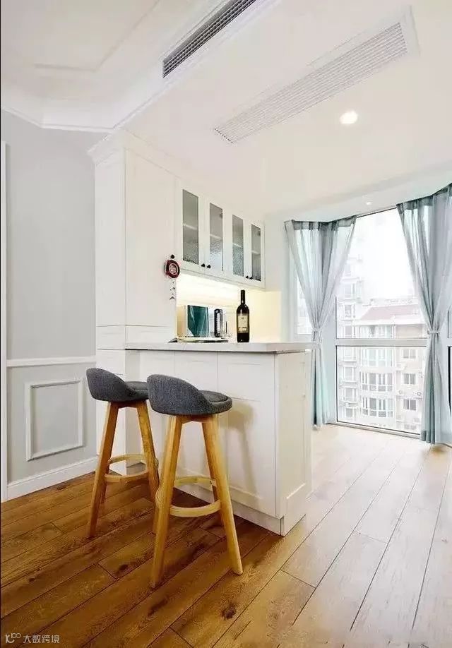比起屏风隔断,用吧台来做客厅阳台之间的隔断,可以为家里增添一个情趣的小角落,约上闺蜜在这里喝杯小酒、聊天谈人生,日子好不惬意。