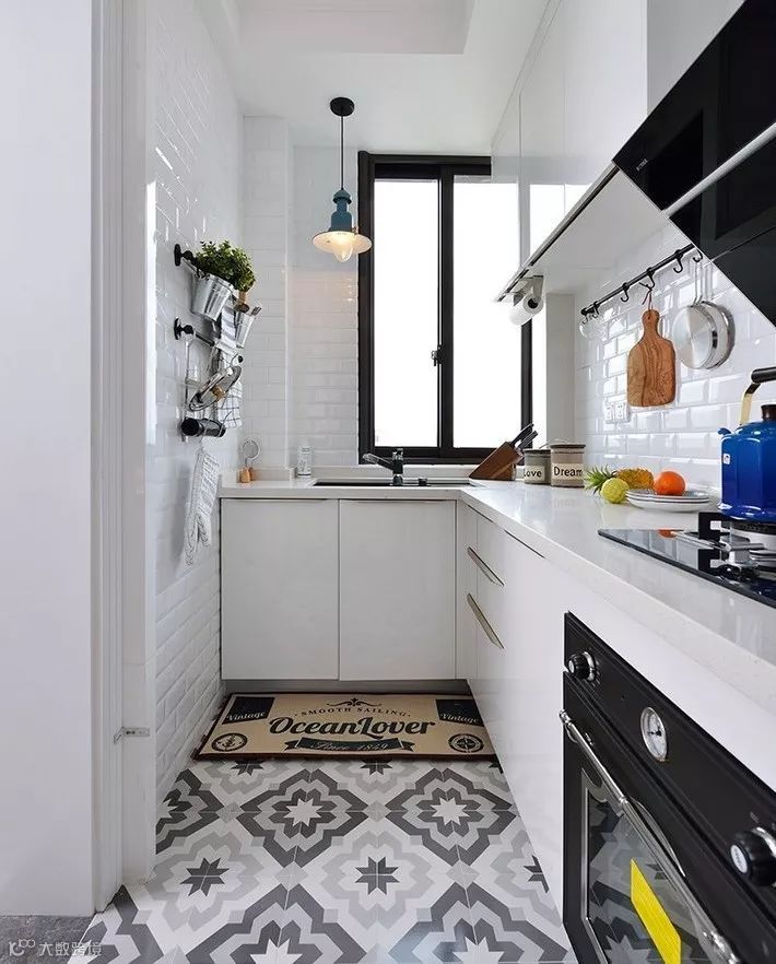 厨房的墙面一般比较单调,实用性远远胜过了装饰性,因而没有太大的亮点。如果用花砖进行装饰,和其他单色砖形成一个视觉上的对比,或许就能轻松打造视觉焦点了。
