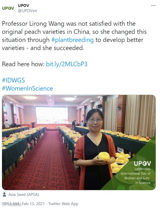 此外,王力荣及其团队也注重多样化育种方向,还获得了多个普通桃、油桃和观赏桃植物新品种权,极大地丰富了中国桃产业品种类型。育成成熟期5月下旬至8月下旬的熟期配套品种,品质显著提高;成功培育出了低需冷量桃品种,拓宽了桃品种的栽培南限,例如桃品种‘中桃红玉’,需冷量500小时,在云南、广东、广西等地表现良好;培育优质、广适油桃品种,占中国油桃栽培面积36%,占设施桃栽培面积70%,其中‘中农金辉’是15年来栽培面积最大设施桃品种;培育花期配套、花色丰富、抗性强的系列观赏桃花品种,育成品种占市场新增份额50%,为“桃花节”成为中国春季亮丽的风景线做出重要贡献。