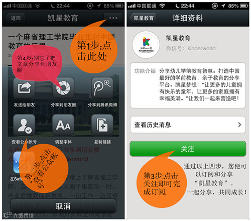 点击右上角按钮即可分享到朋友圈, 直接点击标题下方“凯星教育”关注凯星教育。