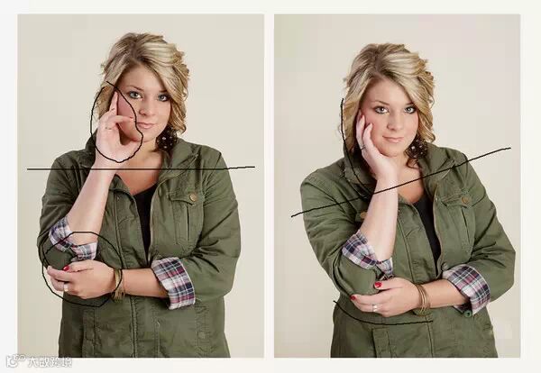不要让你的手臂紧贴在身上,很显然,左图大臂被压扁了,从相片里看,很是显胖。右侧这样的姿势是不是更显瘦?