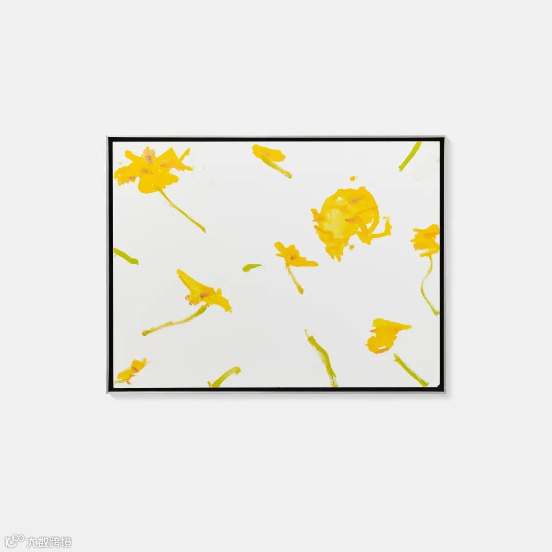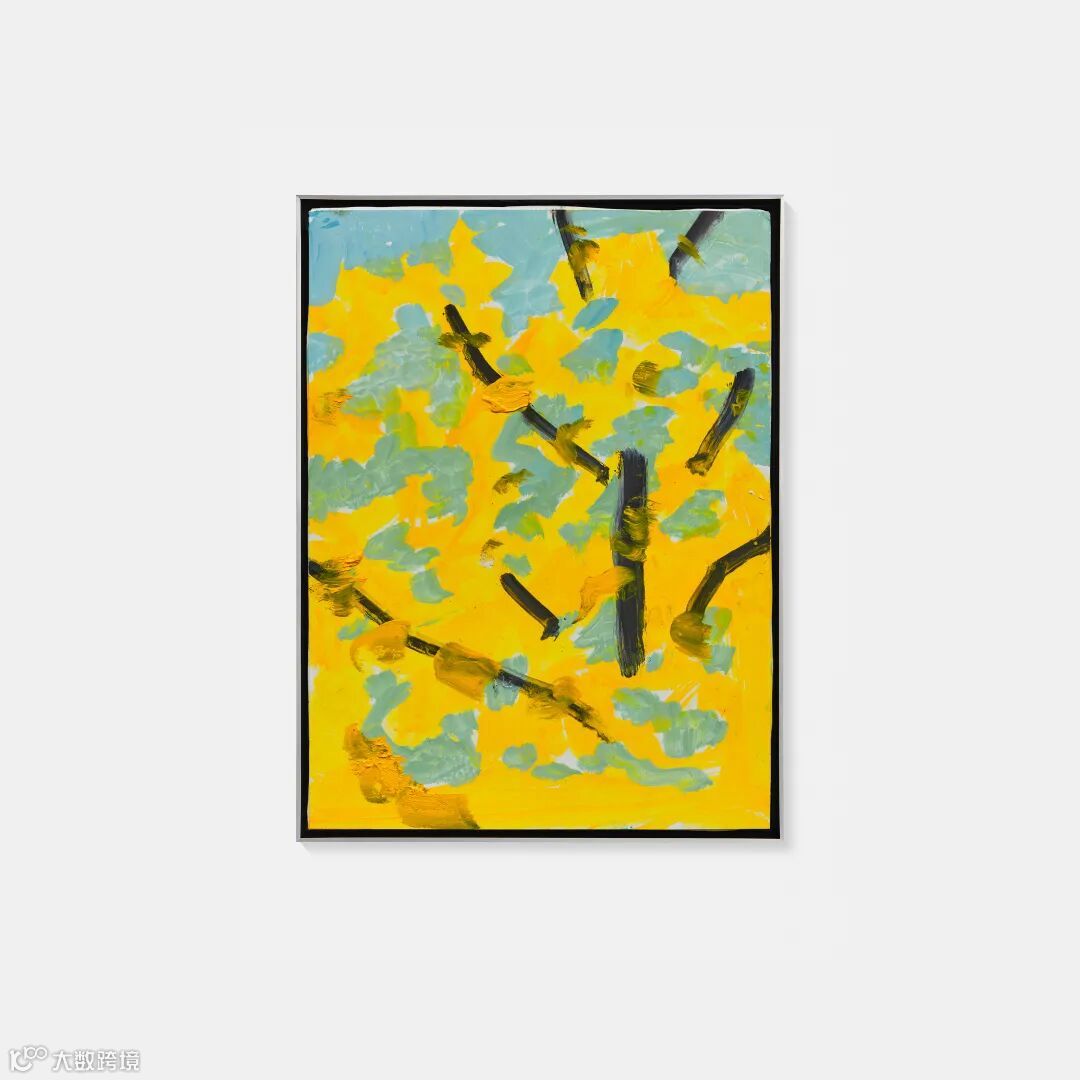 本次展览还将展出14件木板油画小幅作品及3件较大尺幅的亚麻布面油画。除一件之外,其余作品皆以被裁切的树木局部为主体:蜿蜒伸展的枝干、沉稳挺立的树干与纤细脆弱的枝条,在斑驳光影与枝叶疏密之间,呈现出各自不同的节奏与气息。这些画面源自艺术家在纽约长期生活与创作过程中所观察到的风景,包括自1968年以来工作室周边的城市环境,以及自1954年起每年夏天居住的缅因州林肯维尔。其中一件创作于2024年的作品 《黄色花朵习作(3)》(Study for Yellow Flowers (3)),描绘了悬浮于柔和蓝色背景中的黄色花朵,仿佛被抛向空中,并从仰视的视角被定格于画面之中,呈现出轻盈而不稳定的视觉张力。