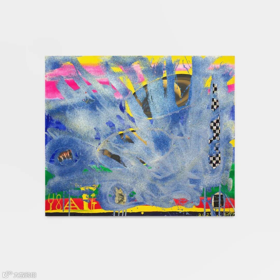 克里斯·马汀(Chris Martin)的两幅绘画作品以绘画与拼贴交织的方式构成充满能量的画面。在 《新宇宙模型提案》(Proposal For A New Cosmological Model, 2024) 中,行星形态与神秘符号被闪耀的群青色笔触覆盖,形成宇宙般的视觉深度。而 《樱桃林(火岛1号)》(Cherry Grove (Fire Island #1), 2024–26) 则以交织的绿色线条构建探索性的结构,间或打开通向绘画事件的空间,仿佛暮色中的风景。