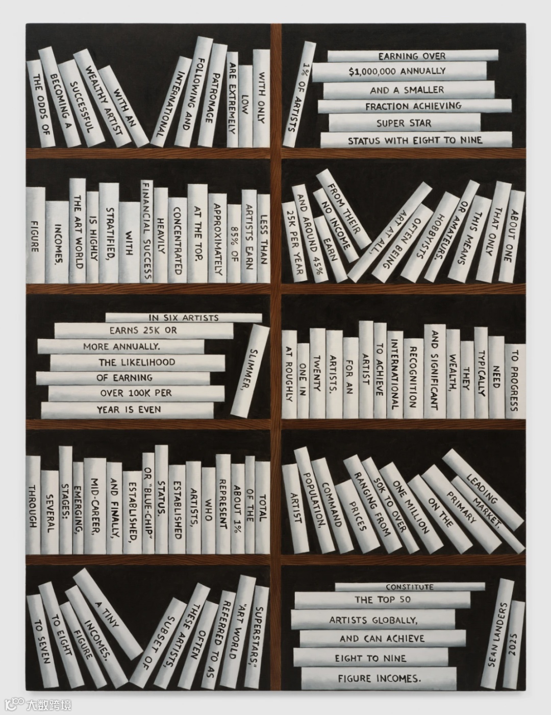 肖恩·兰德斯(Sean Landers)的新作《概率1一3》(The Odds 1–3,2025)由三幅精心绘制的巨型画布组成,细腻呈现了一个布满书籍的书架,每册书脊上均印有清晰可辨的文字。这些书名共同构成一组统计数据,直指艺术家在现实中获取商业成功的微渺可能。作品呼应了兰德斯1990年代初期的文字绘画创作,那些黑白书写的文本深刻映照出艺术家的幽默、自嘲与内心焦虑。